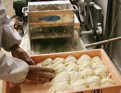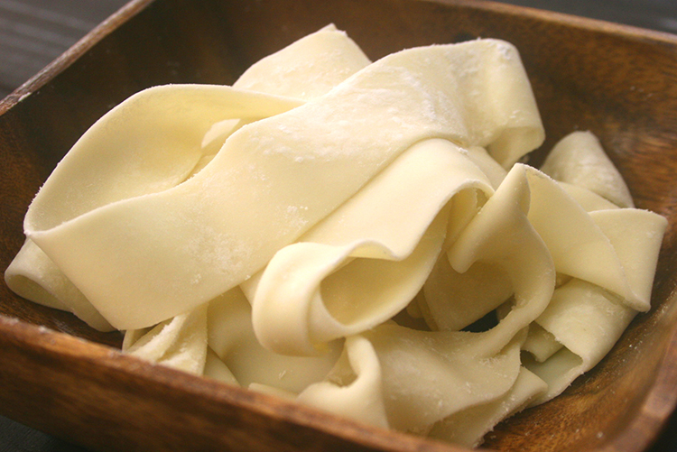 ハイフォンのバインダークア(蟹汁バインダー)が有名です。ライスペーパーのことを「バインダー」とベトナムでは言いますが、それと同じで麺のバインミーも米汁を蒸したものを干して、乾燥させてライスペーパーにしてからカットして使うもので、ハイフォンでは半分だけ乾燥させた「半生麺」が食べられています。糖液を加えて茶色く色づけるバインダードーと白いプレーンなタイプがあります。当店ではこれからヒントを得て、冬季限定で「煮込みフォー」用に製麺しています。