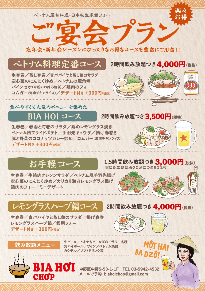 ★ビアホイチョップ(中野店)では、1.5時間の飲み放題で3000円というお手軽なコースがあるところと、2時間飲み放題でも3500円からと、リーズナブル!ベトナム居酒屋「ビアホイ」ならではのメニュー内容なのも、おススメポイントです‼
